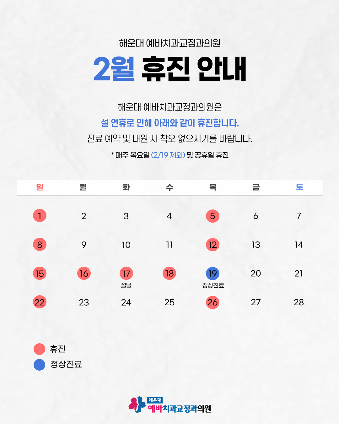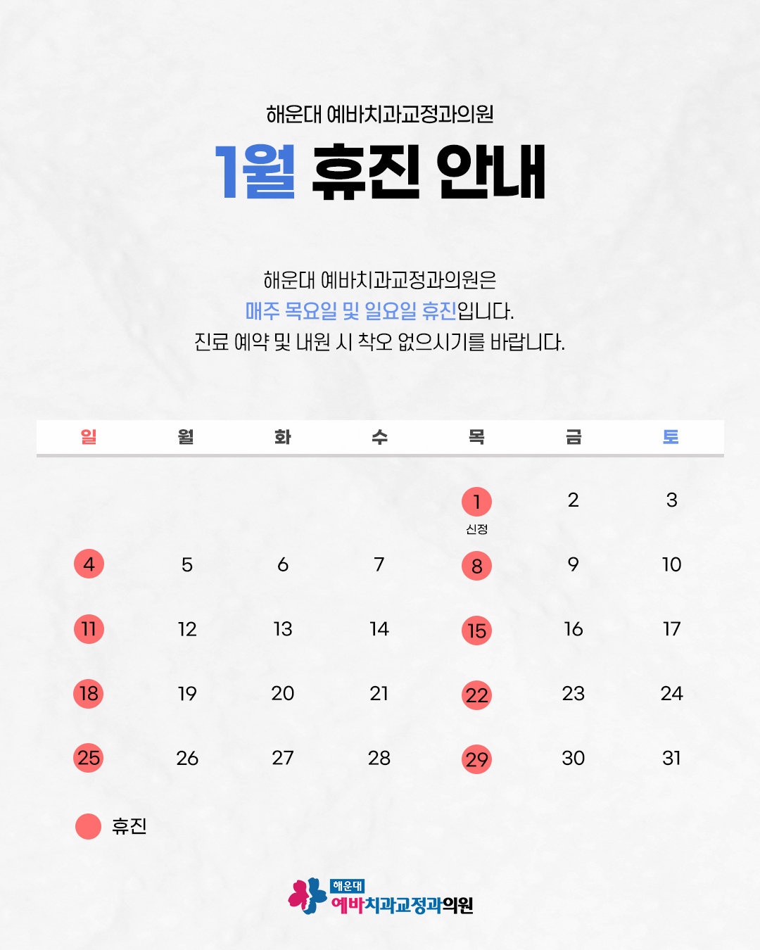 * 목요일, 일요일 및 공휴일은 휴진합니다.